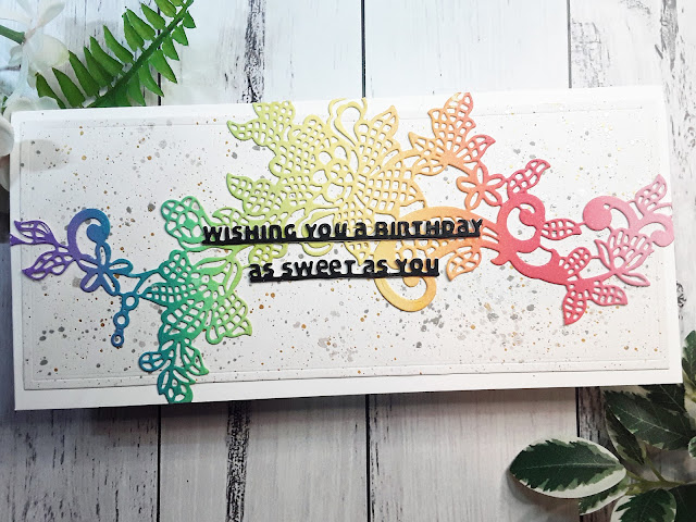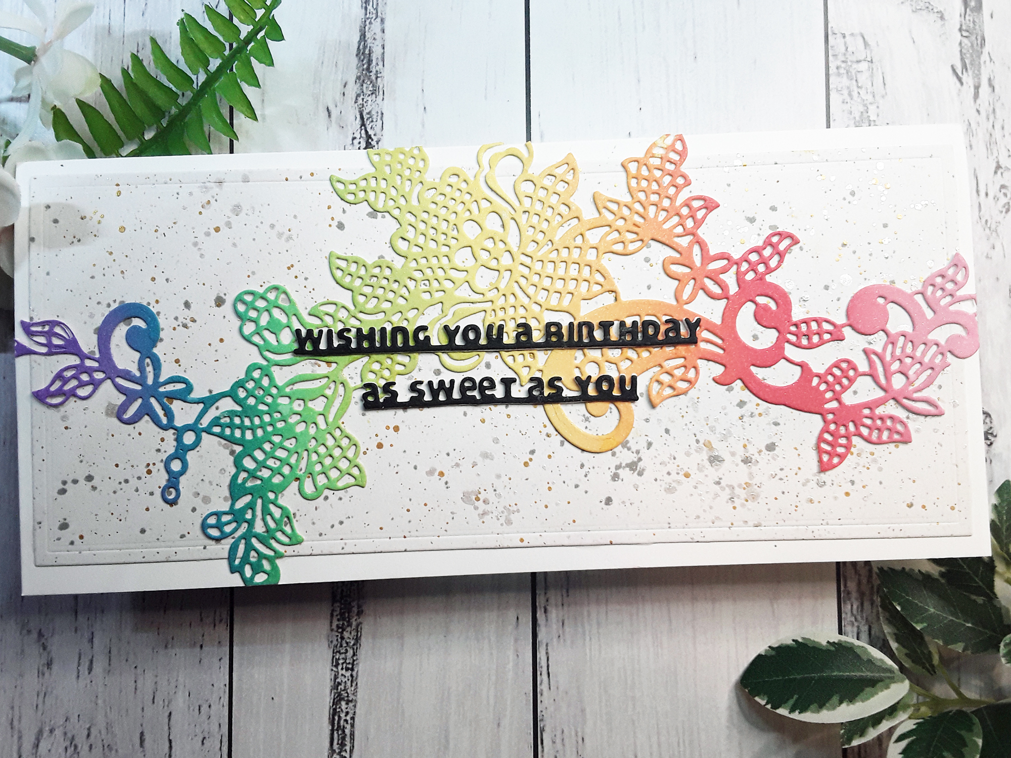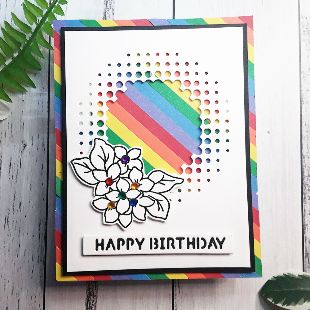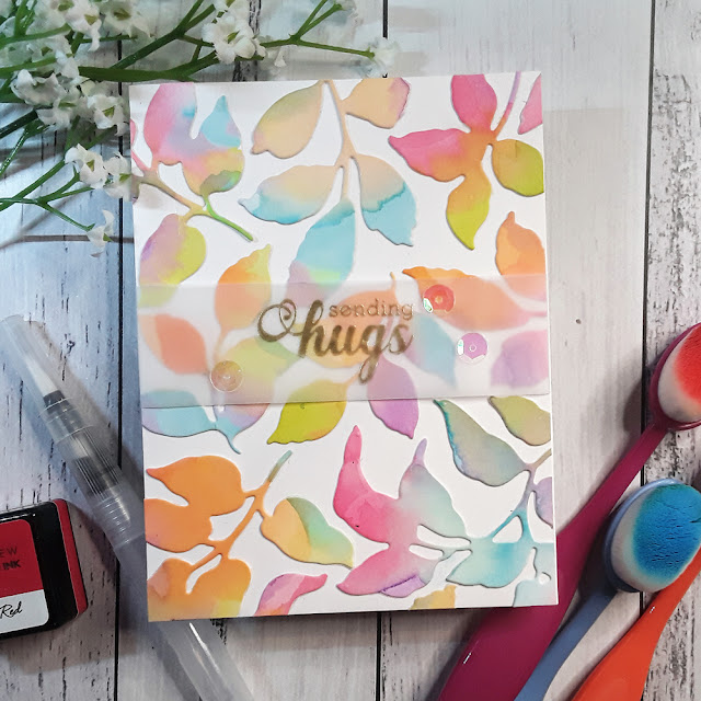 For this rainbow card, the ladies were shown how to create their own backgrounds using the Altenew dye inks as watercolours, what colours to blend to create new colours and which ones to avoid painting too close together. The panel was then used to die cut the leaves using Altenew Just Leaves die set https://altenew.com/products/just-leaves-die-set and I demonstrated how to puzzle piece the images onto the panel and cut off the excess to fill in little gaps.