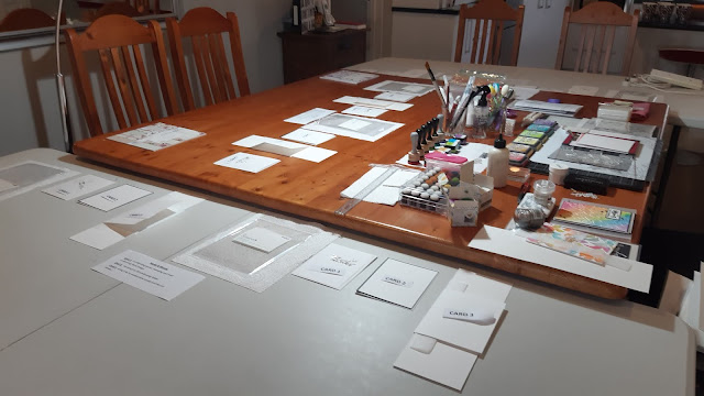 I spent the day setting up the extra tables in my dining room, making sure that all the supplies for each card were clearly marked for each person and an instruction sheet typed and printed out so that everyone would easily know what they would need to do. Below are a few photos of my demo space and how I set up for each person - I decided to have the ladies work in pairs and each pair had a different starting card so that no supplies were required by all 6 at once!