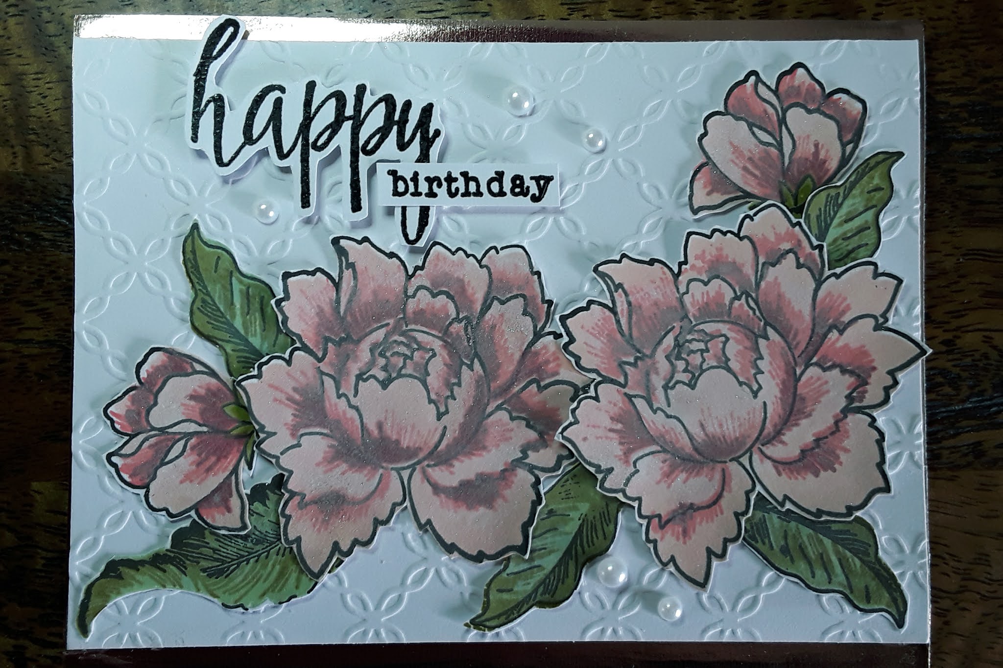 This card was such fun to create! I chose the Altenew Peony Bouquet layering stamp set as I love classic beauty of this stamp set. I used my stamping platform to create the flowers and leaves as I find this easier, especially if you are making more than 1 flower. I used Distress Oxide inks in three complimentary colours to create these beautiful dusty pink blooms and buds and also 3 green inks for the leaves.