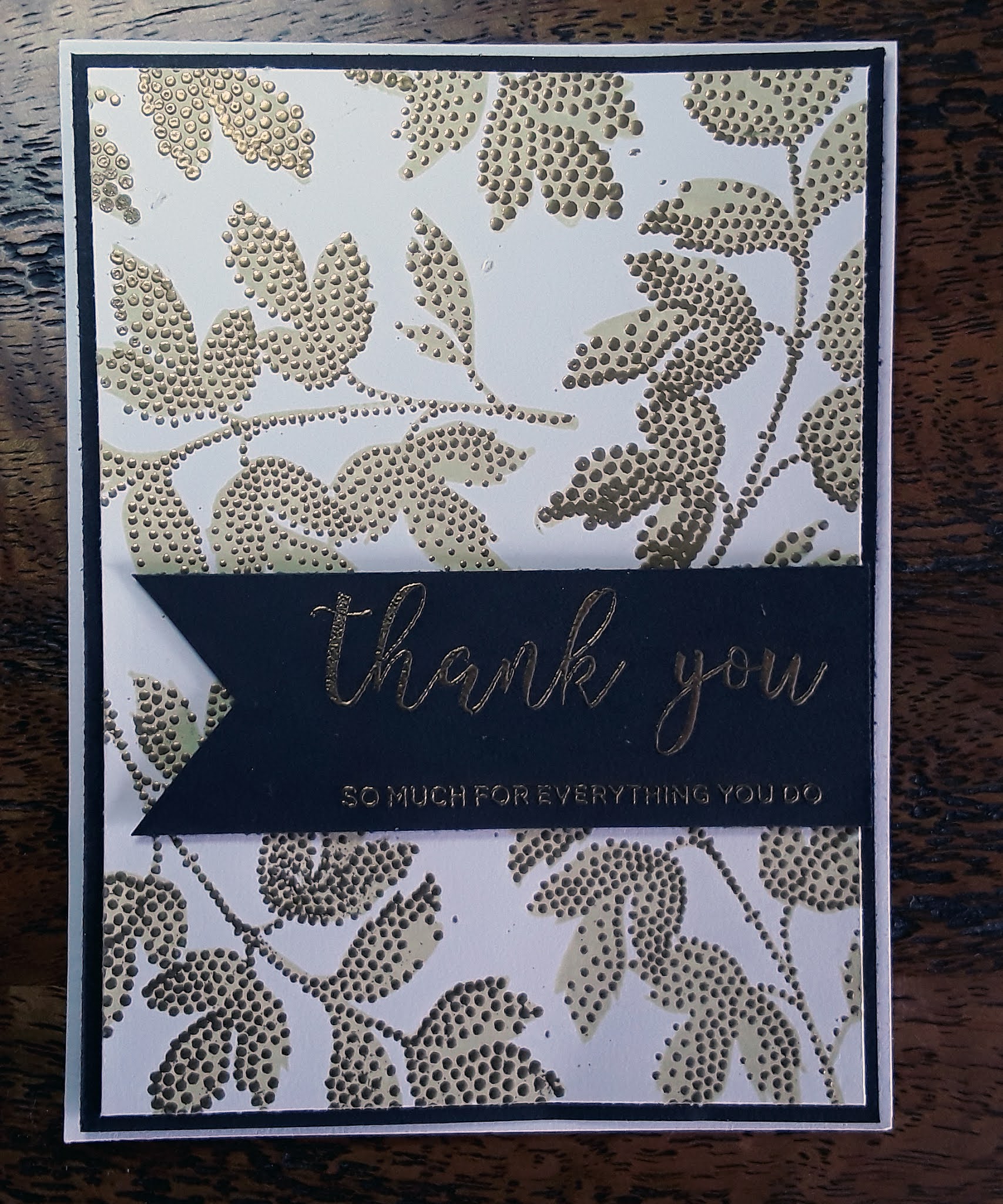 For this card I used the Altenew Dot Botanicals Stamp Layering set and I stamped repeatedly in various directions on the A2 card panel using a light green ink. I made sure that some of the images were stamped off the card as this looks more natural. I stamped the second layer over the green layer using Versamark embossing ink. I then sprinkled a gold embossing powder over the wet ink and heat set this.