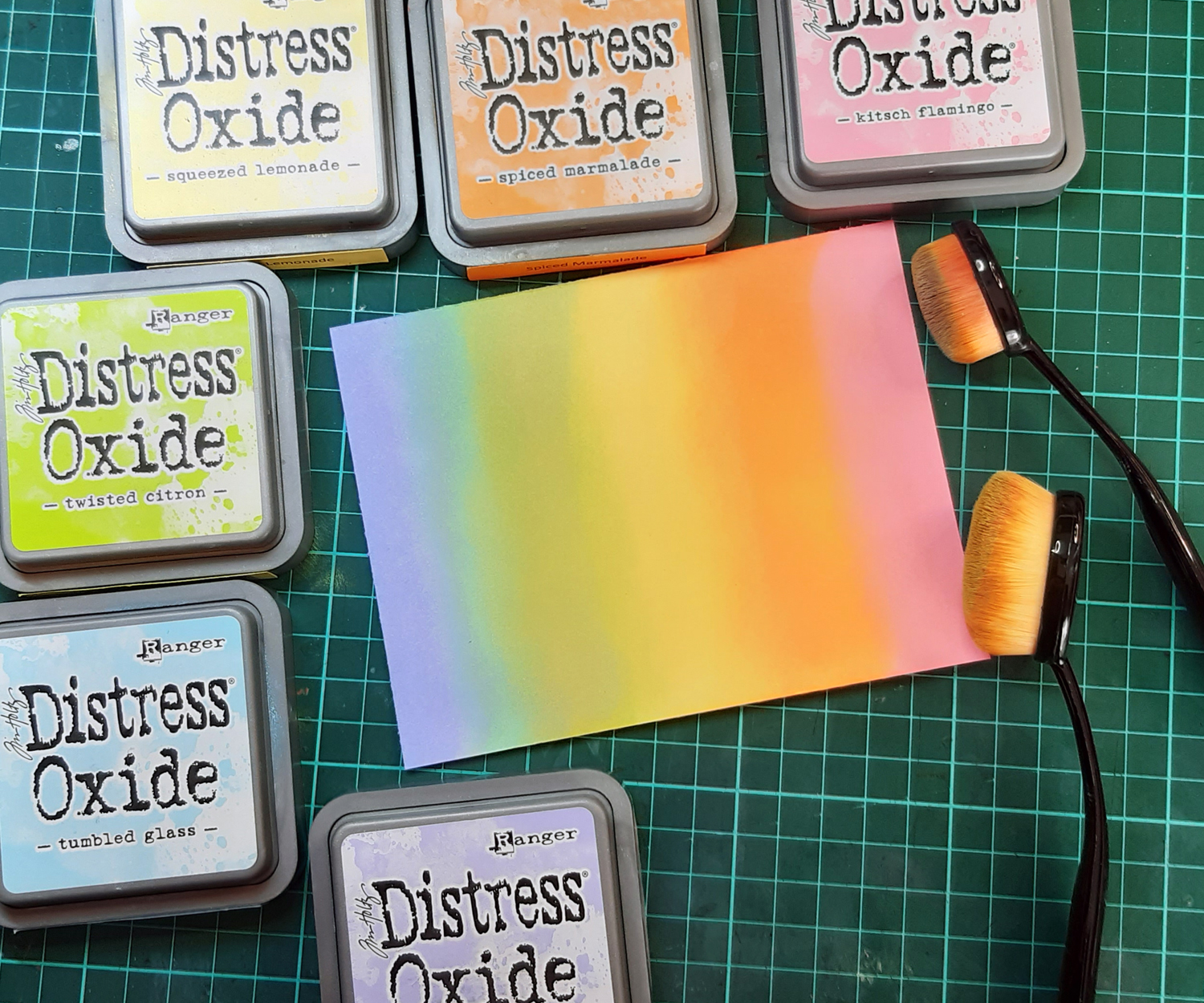 The colours I used were Kitsch Flamingo, Spiced Marmalade, Squeezed Lemonade, Twisted Citron, Tumbled Glass and Wild Lilac. I used an ink blending brush to apply a soft layer of colour an making sure that I went back over an area twice to intensify the colour and then to blend two adjacent colours together to form a smooth transition and soft blend.