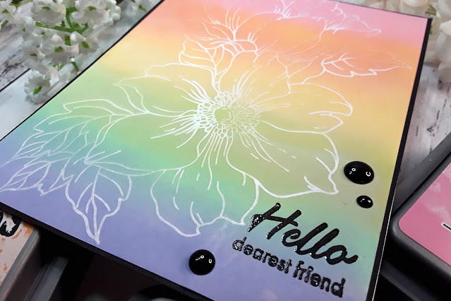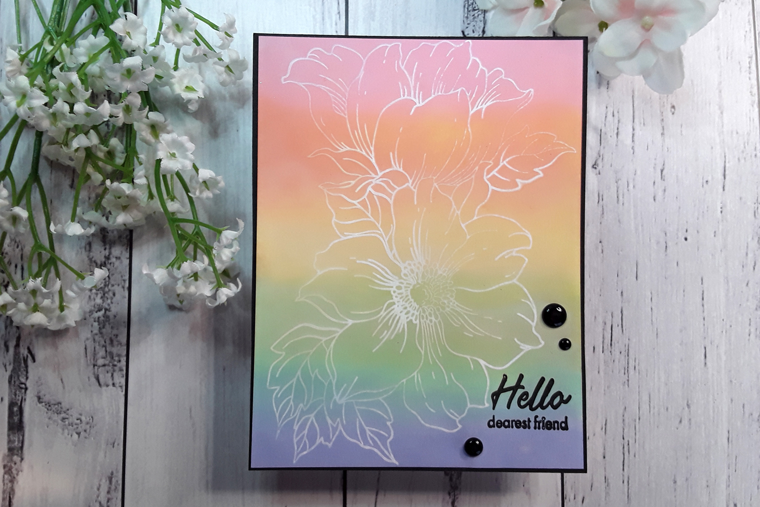 When I was happy with this blend I decided to use the Altenew Statement Flowers stamp set https://altenew.com/products/statement-flowers-stamp-set because it is a large floral outline design with lots of open spaces which would allow the background colours to still show up well.