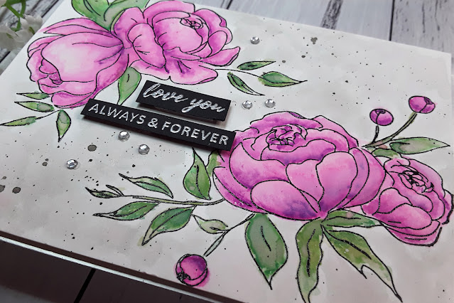 I used Altenew crisp die inks in colours Rose Quartz, Cosmic Berry, Purple Wine, Forest Glades and Evergreen which are water-reactive inks so work really well for watercolouring too! I took my time and started with wetting one petal at a time with plain water using a small paintbrush and then dropping small amounts of the lightest pink into that area and covering the whole petal. I repeated this for each area. When that layer was dry I added darker shades to give more depth and accent the areas where there would naturally be more shadows, like the under side of each petal.