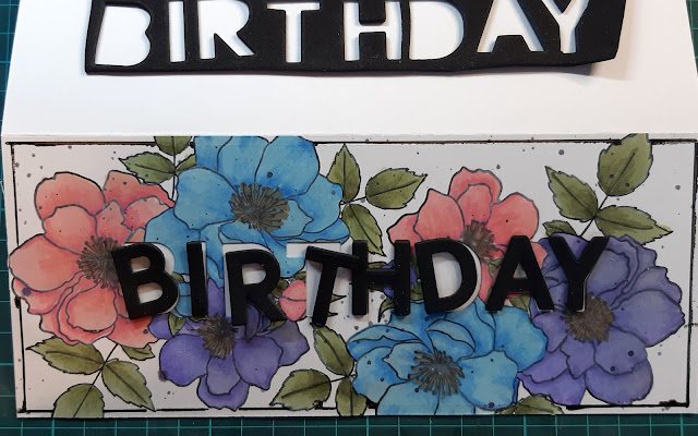 From black fun foam I die cut the same letters and adhered them into the holes on the card base. I then adhered the die cut floral letter back into their correct positions, including the land-locked pieces.