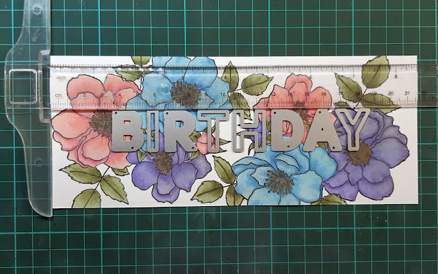I used my T-ruler to help me space out the letters and make sure that they were lined up in a straight line. When I was happy with the placement, I added a long piece of purple tape across all the letters to keep them in place, then ran the panel through my die cutting machine. I made sure I kept the landlocked pieces from the B, R, D and A letters. I used a black fineliner marker to add a border around the card.