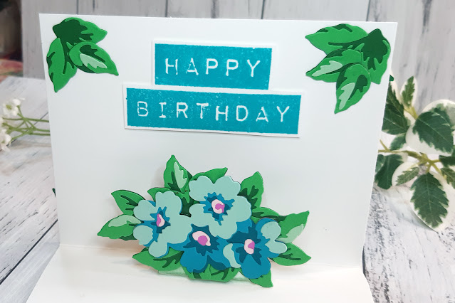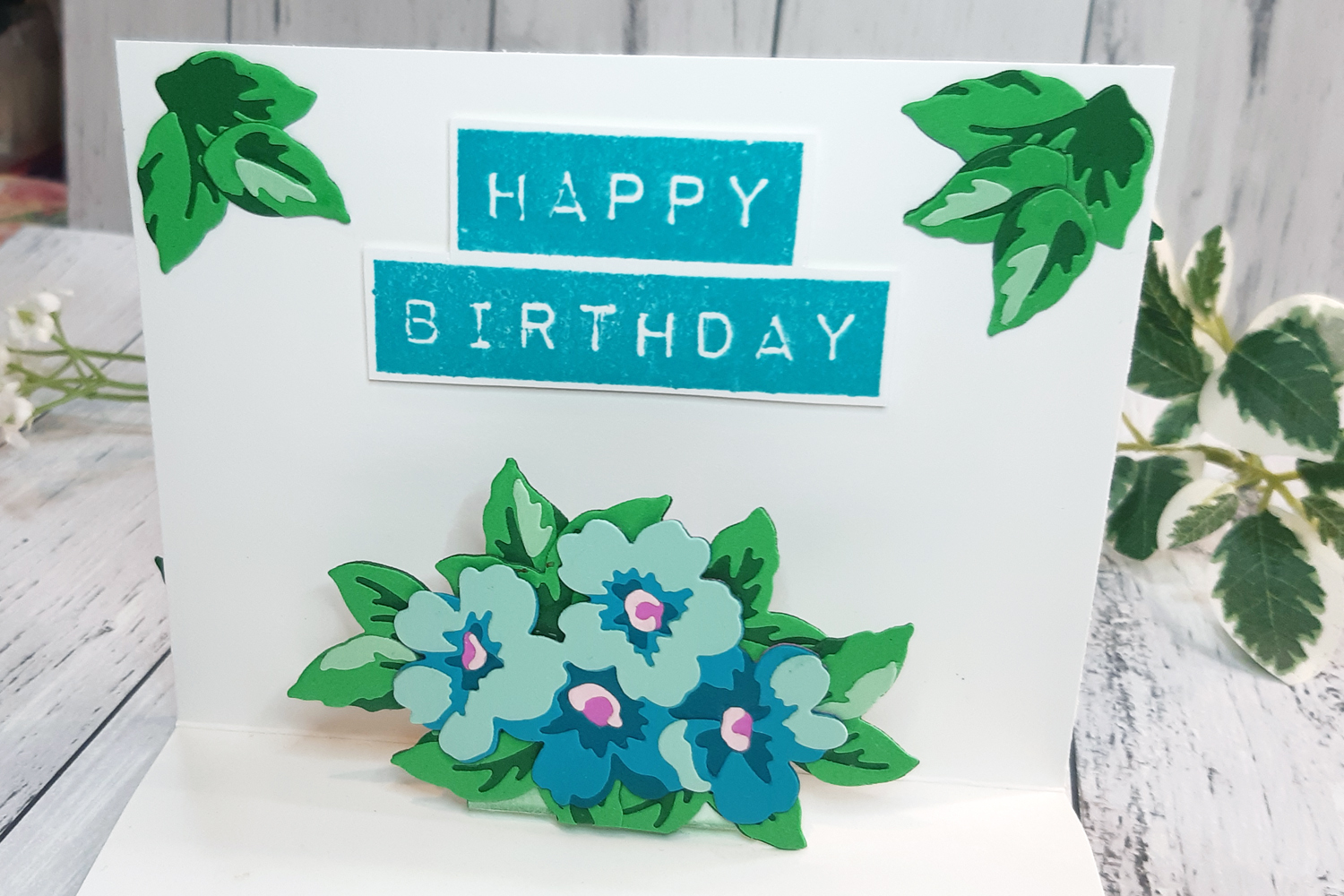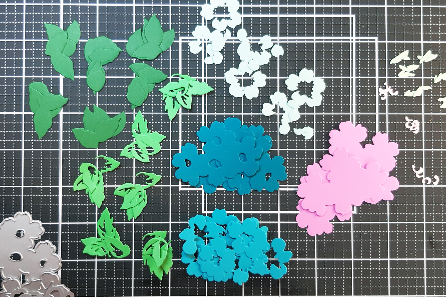 It is fun to do something different with a card, just for a change and to make it more interesting for the recipient. I used the Altenew Mini Flower Cluster Die Set https://altenew.com/products/mini-flower-cluster-layering-die-set to die cut 3 flower clusters and 6 sets of leaves, layer them up and adhere as per the layering guide which comes with the set.
