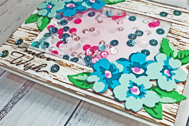 and inked over the raised parts with some brown ink to create a woodgrain effect. I used the brown as I like brown and teal together. I inked the inside of the shaker with pale pink ink before adding acetate to the open rectangle then adding a double layer of foam tape around the edge to create a "moat" before adding some teal, pink and white sequins from my stash. I added a sentiment embossed with Versafine Onyx Black ink onto vellum and heat set with clear embossing powder. A few matching sequins around the frame finished off the card..