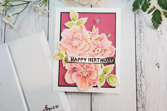 I took my time to start with a very light pink from the 36 pan watercolour pallet https://altenew.com/products/watercolor-36-pan-set and used the wet-on-wet technique taught in one of the tutorials. As the embossing creates a "well" it is easier to control the water and ink as it stays inside each area. I air dried between layers and added darker pinks for shadows and some yellow for a varied look. I did the same for the leaves. I die cut the image out using the coordinating die, added foam tape ready to adhere to the card base. I die cut some pink and black cardstock from my stash to layer up, added some black splatters to the panel and then adhered the floral image to the panel. The sentiment was die cut from rose gold card stock using the Essential Sentiment Die Set https://altenew.com/products/essential-sentiment-strips-die-set with some black cardstock behind the open letters so that the words would be more visible. This was adhered using foam tape and a few glitter gems finished the card.