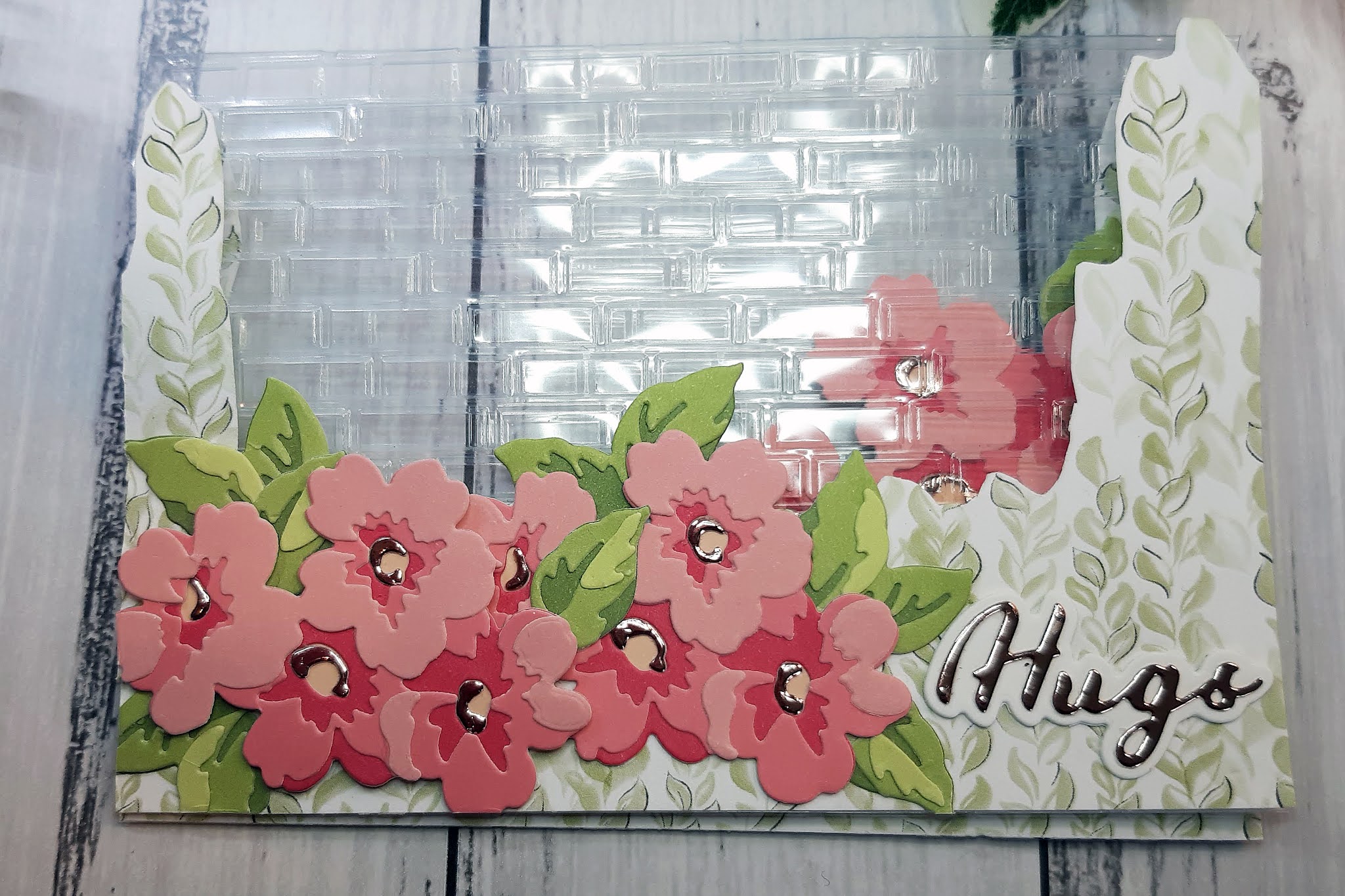 I then took the Mini Flower Cluster Layering Die Set https://shrsl.com/36oql and die cut 3 sets of flower clusters and leaves. I used various shades of pink from the Red Cosmos Gradient Cardstock https://shrsl.com/36oqn and Green Meadows Gradient Cardstock https://shrsl.com/36oqr to die cut the layers and layer them up using the layering guide provided in the set. I used some rose gold metallic cardstock to die cut the flower centres and the same cardstock to die cut the sentiment from the Simple Greetings Die Set http://shrsl.com/36oq4